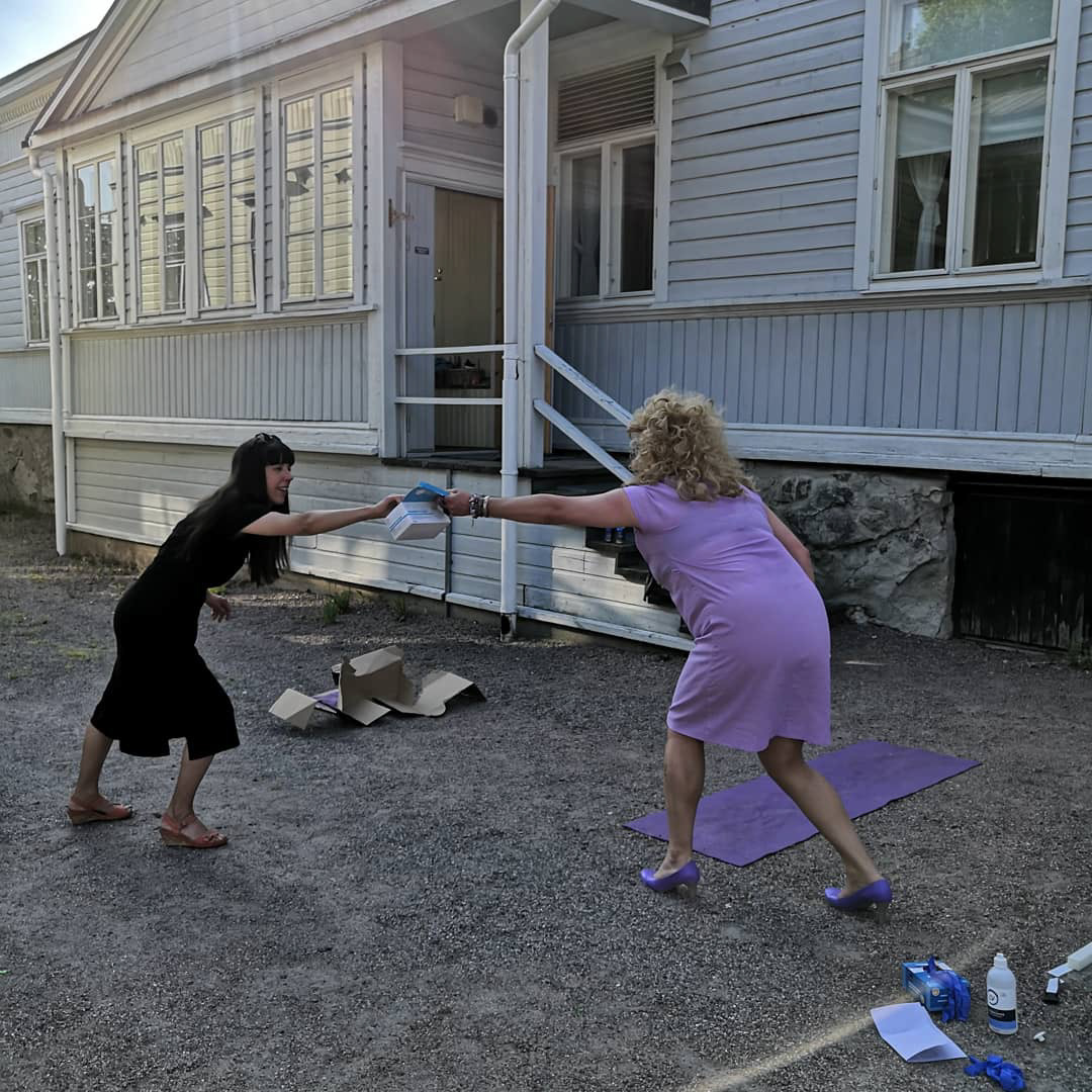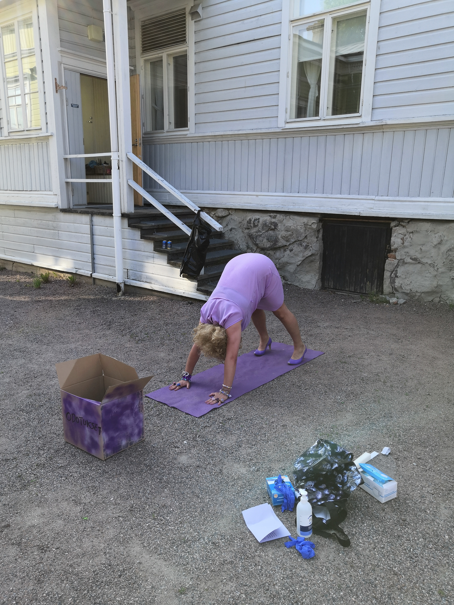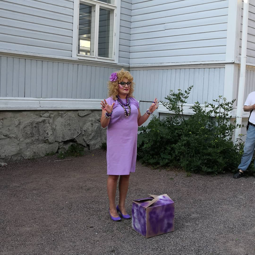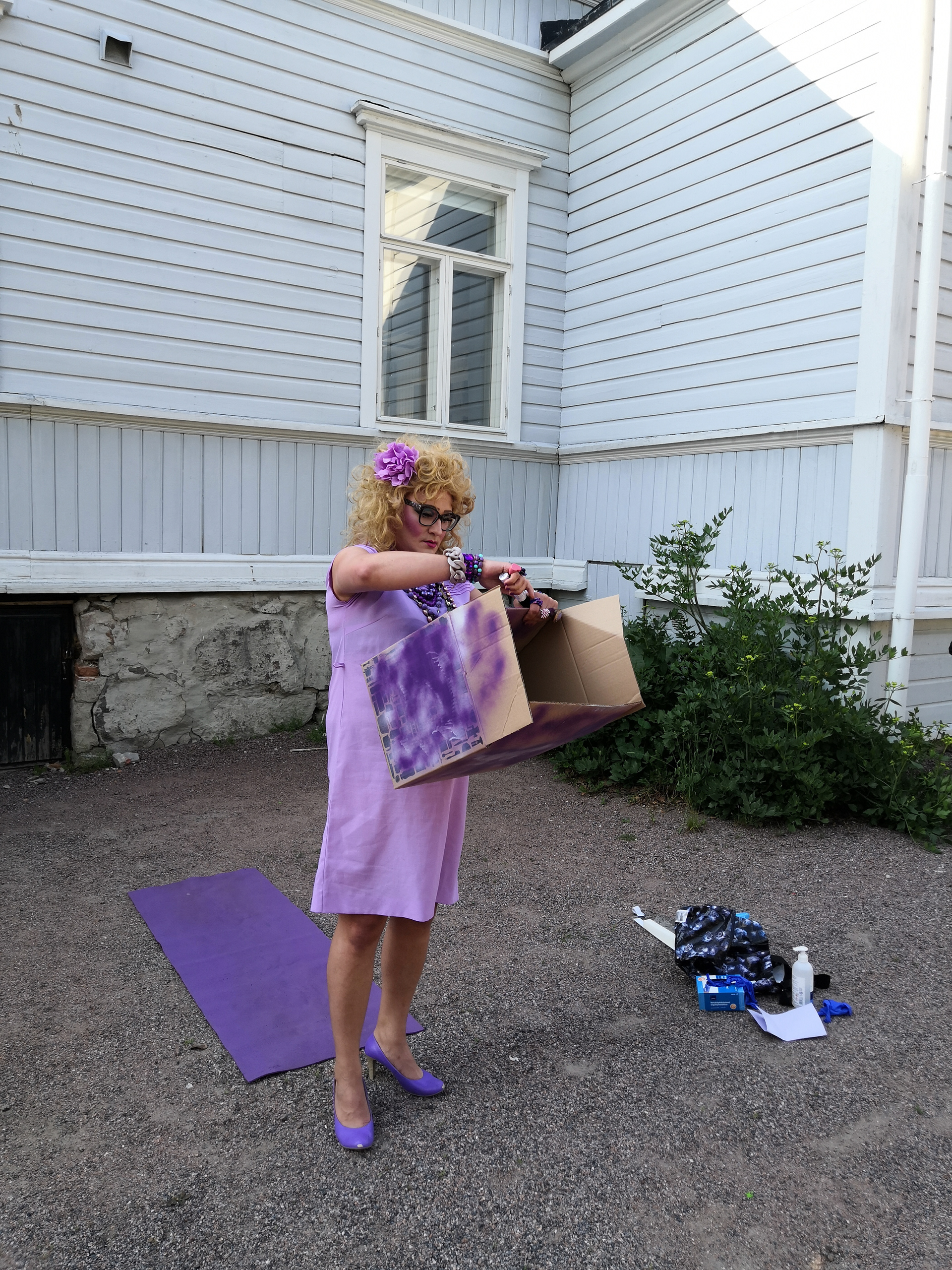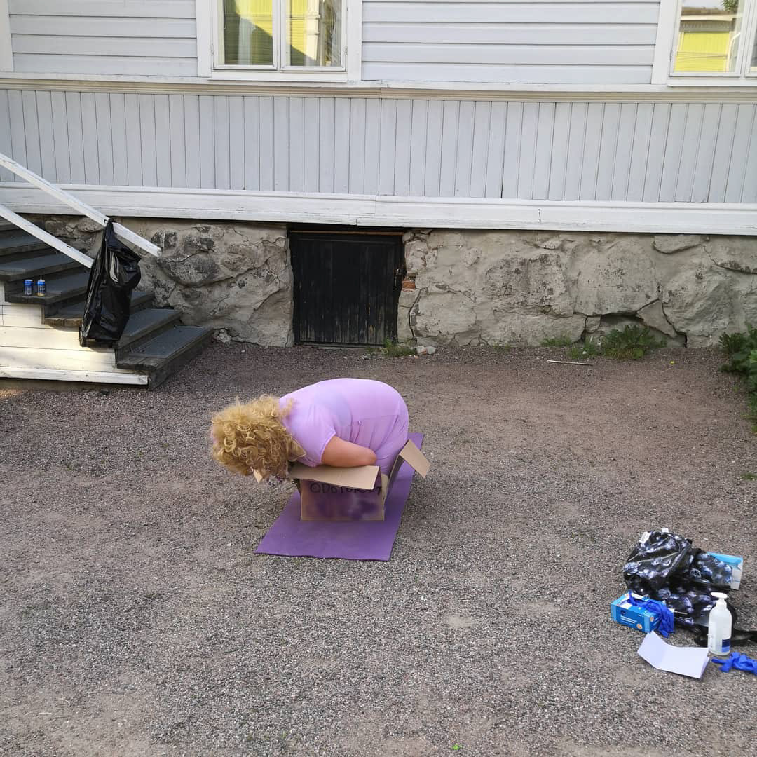 In the performance, my drag alter ego takes cover to shake hands with the guest of the exhibition. She connects with her mind through yoga. In the end, she gets stuck in the box of expectations.