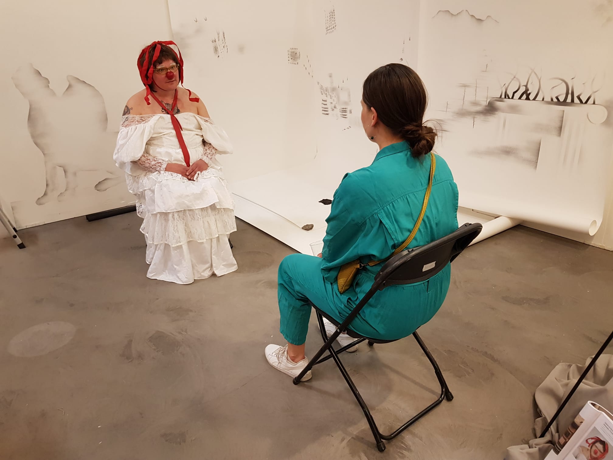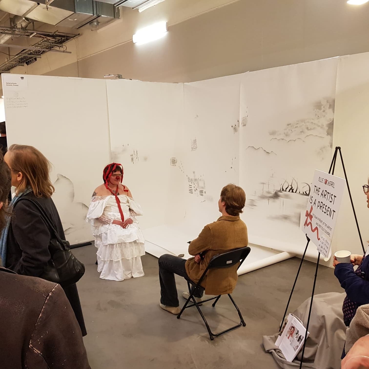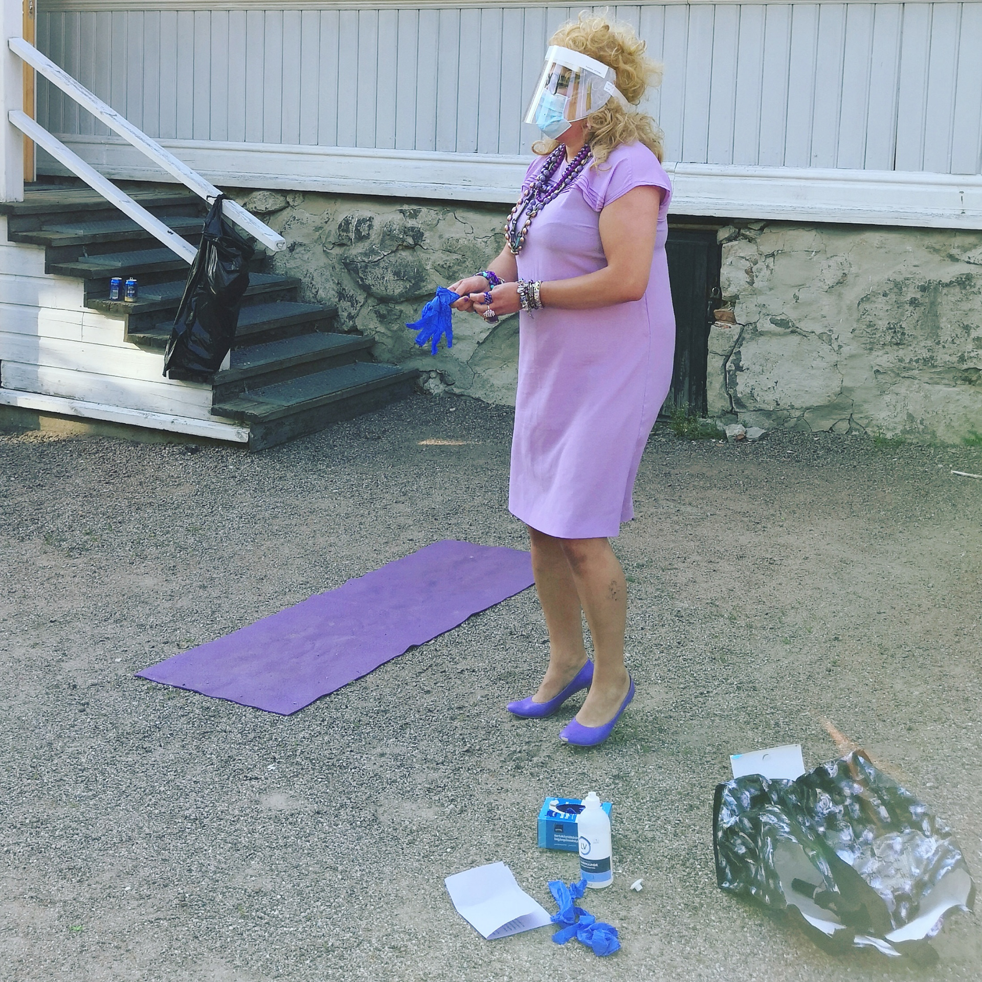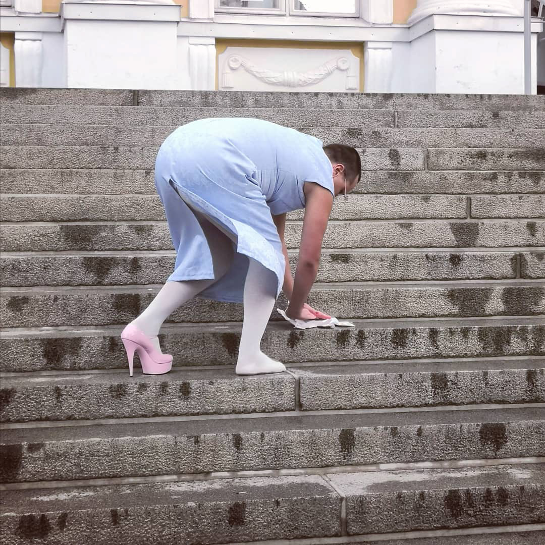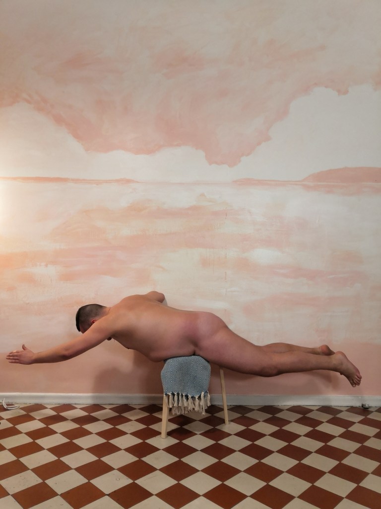 In the performance, my drag alter ego takes cover to shake hands with the guest of the exhibition. She connects with her mind through yoga. In the end, she gets stuck in the box of expectations.