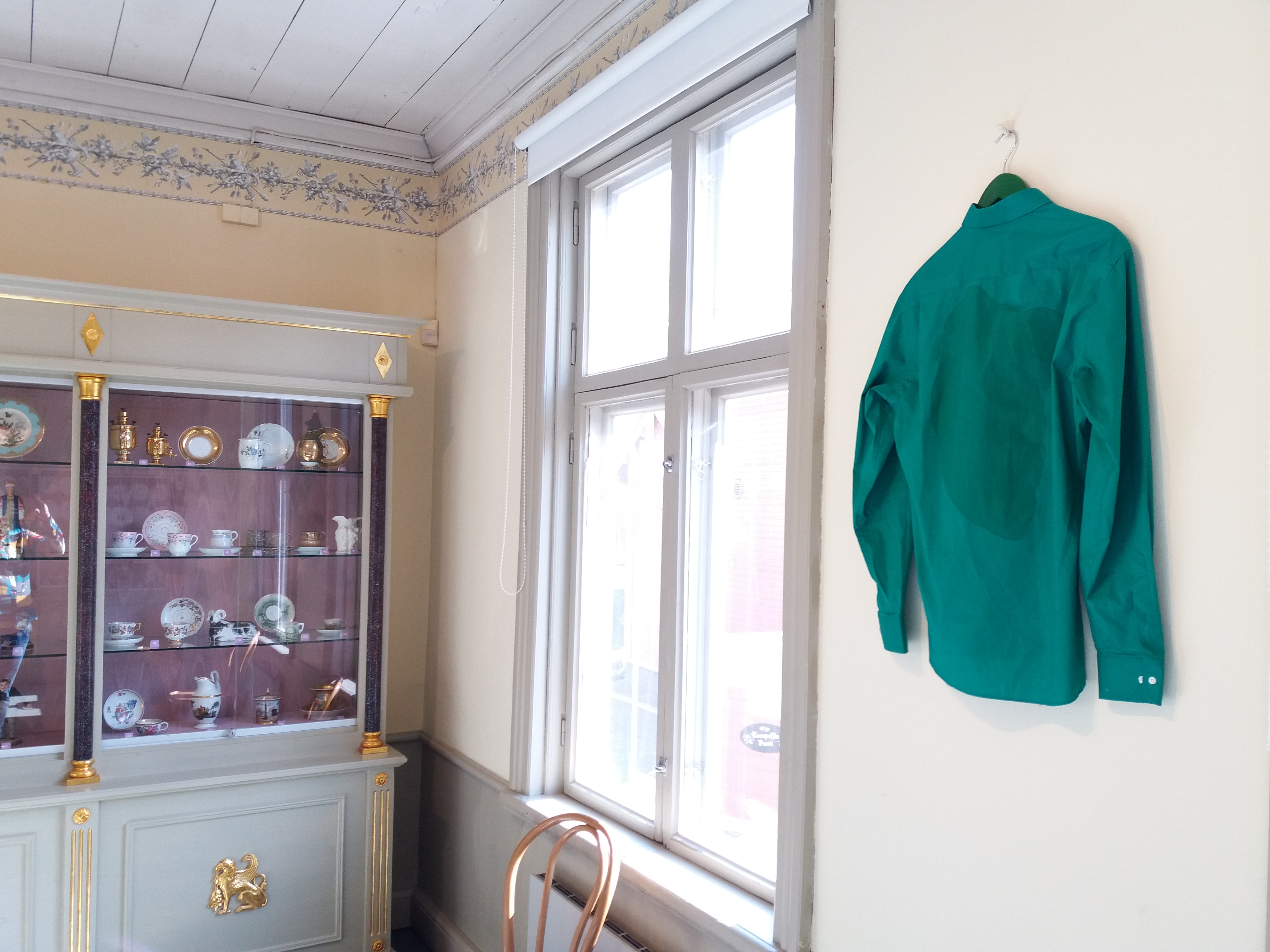 In the performance, I danced the residents of the nursing home.The shirt remained as a memory. I copied the sweat stain with fabric paints.