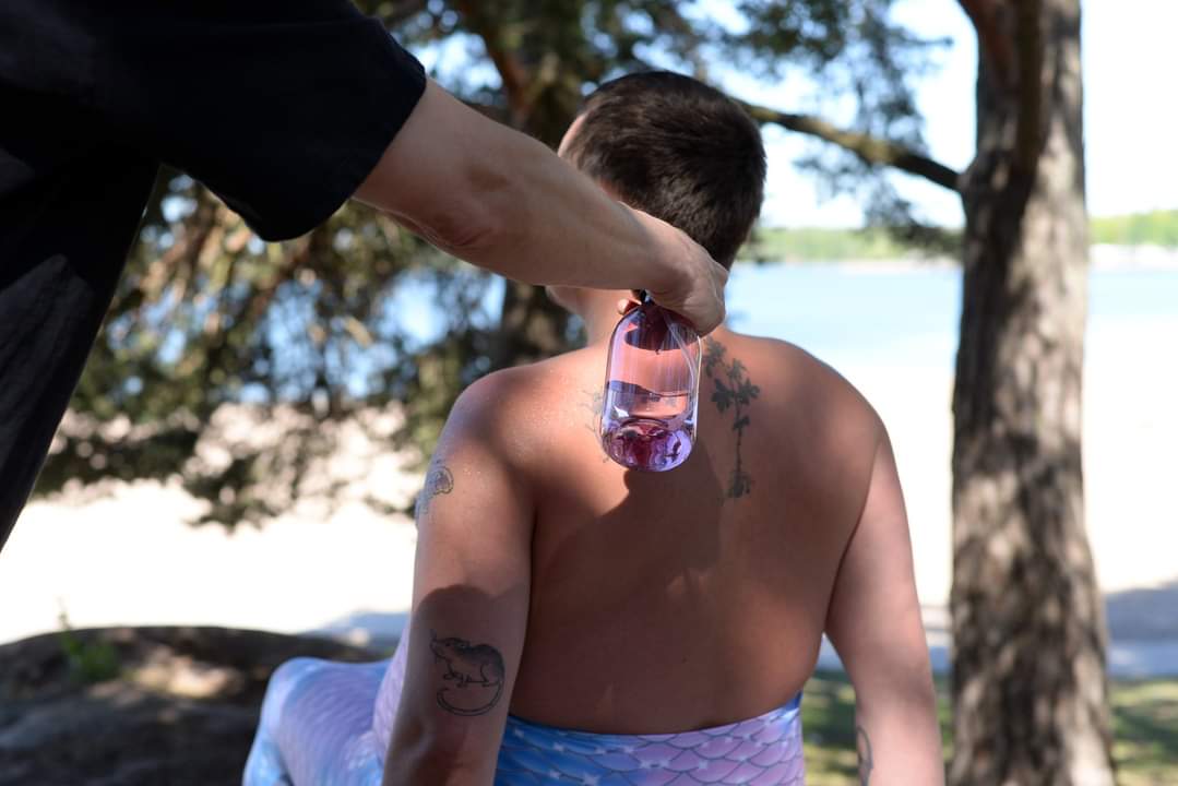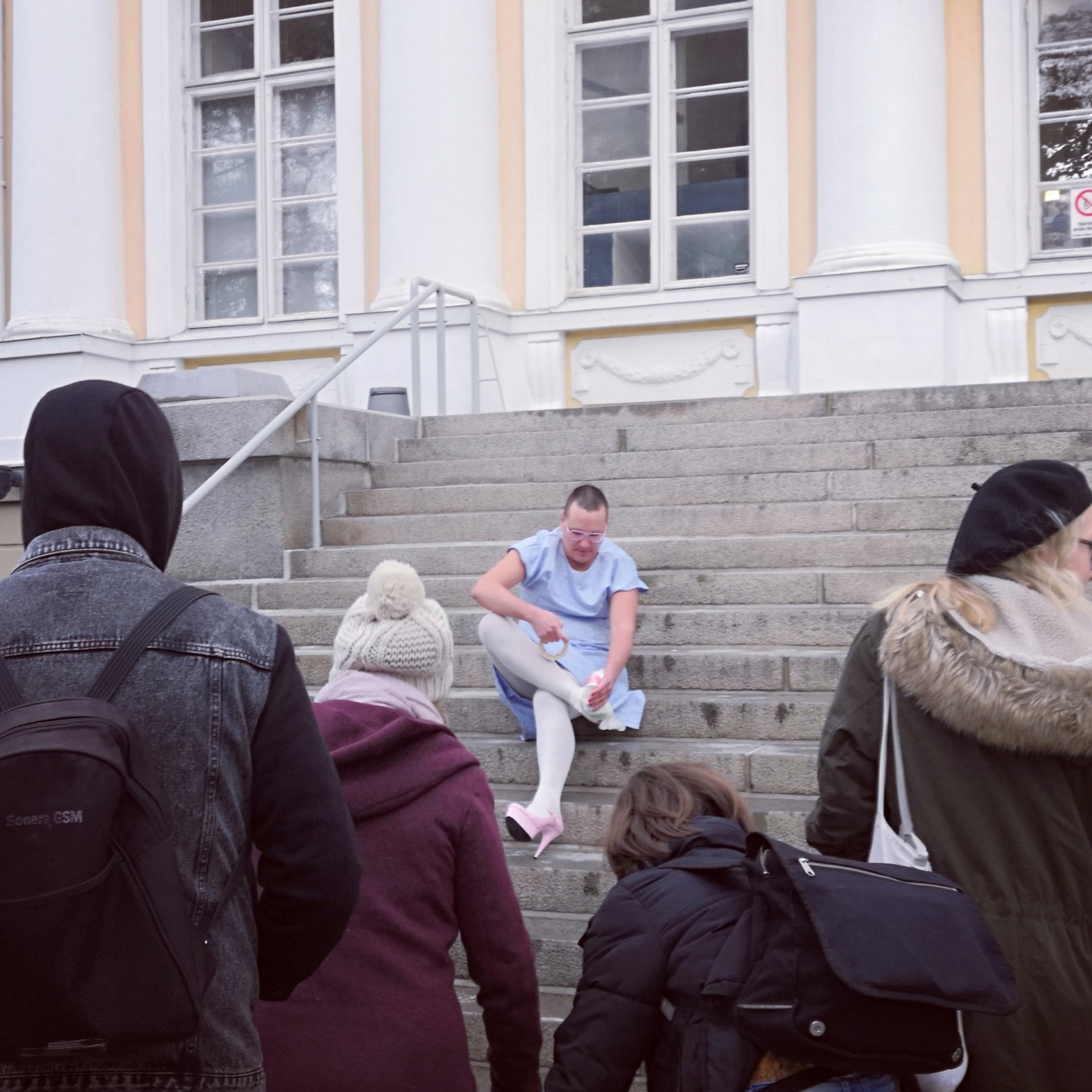 In the Little Mermaid performance, the non-binary mermaid character’s species is on the brink of extinction, and they are searching for a new habitat in the city. They ask the audience/passersby if there is space for them in the city. They also inquire about where they can find a safe restroom.