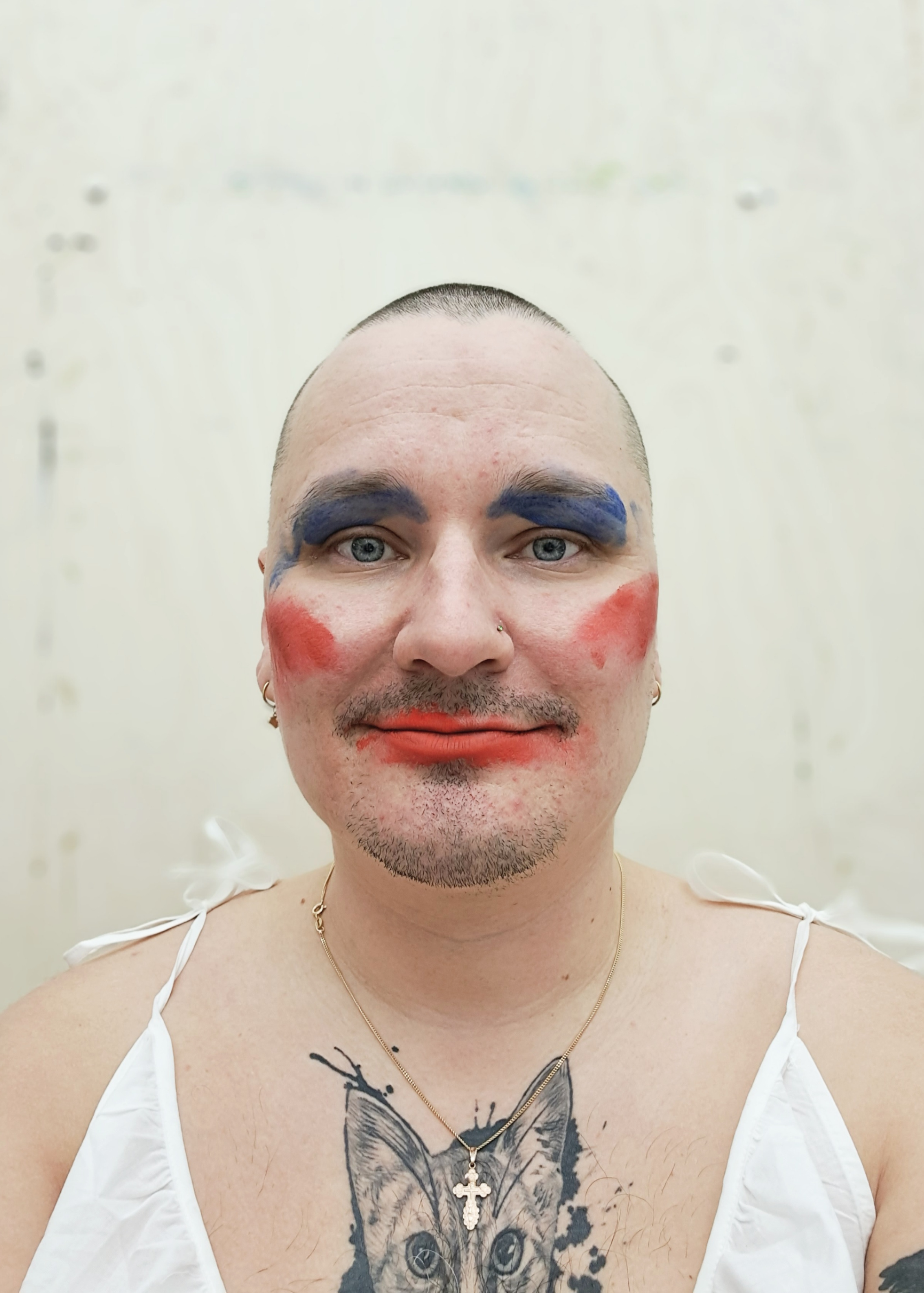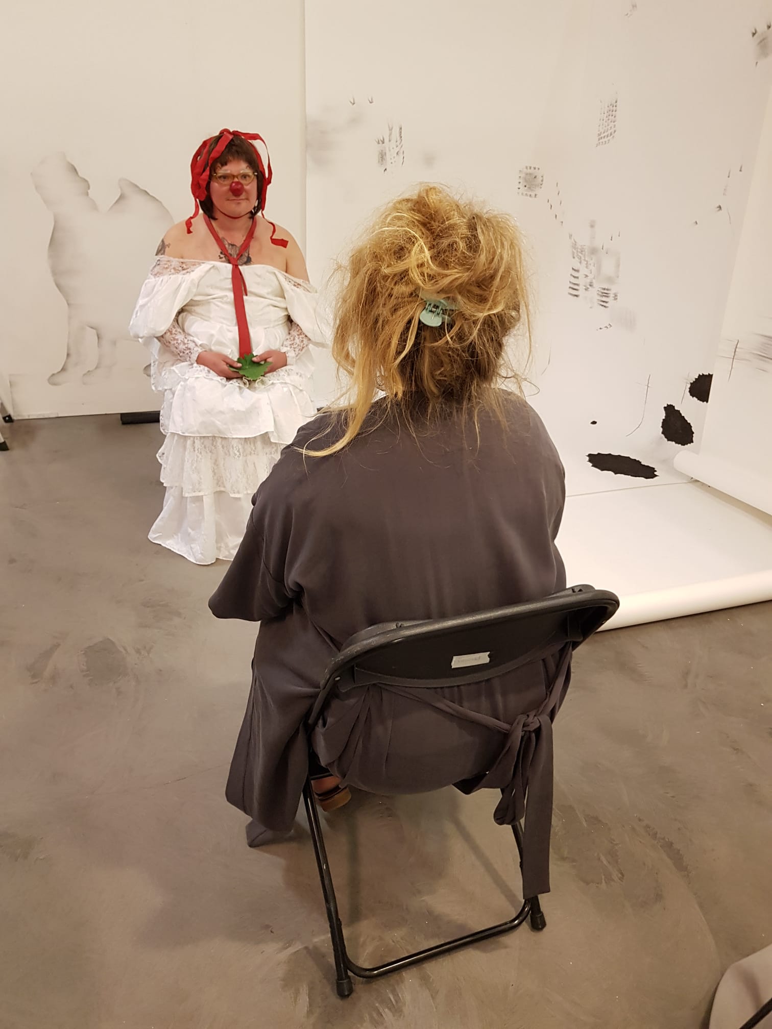 In the performance, an audience member sits in front of me. I get up to look at him. I do the exercise ”waking up the clown” in front of everyone. I look at the other as if I had just been born.