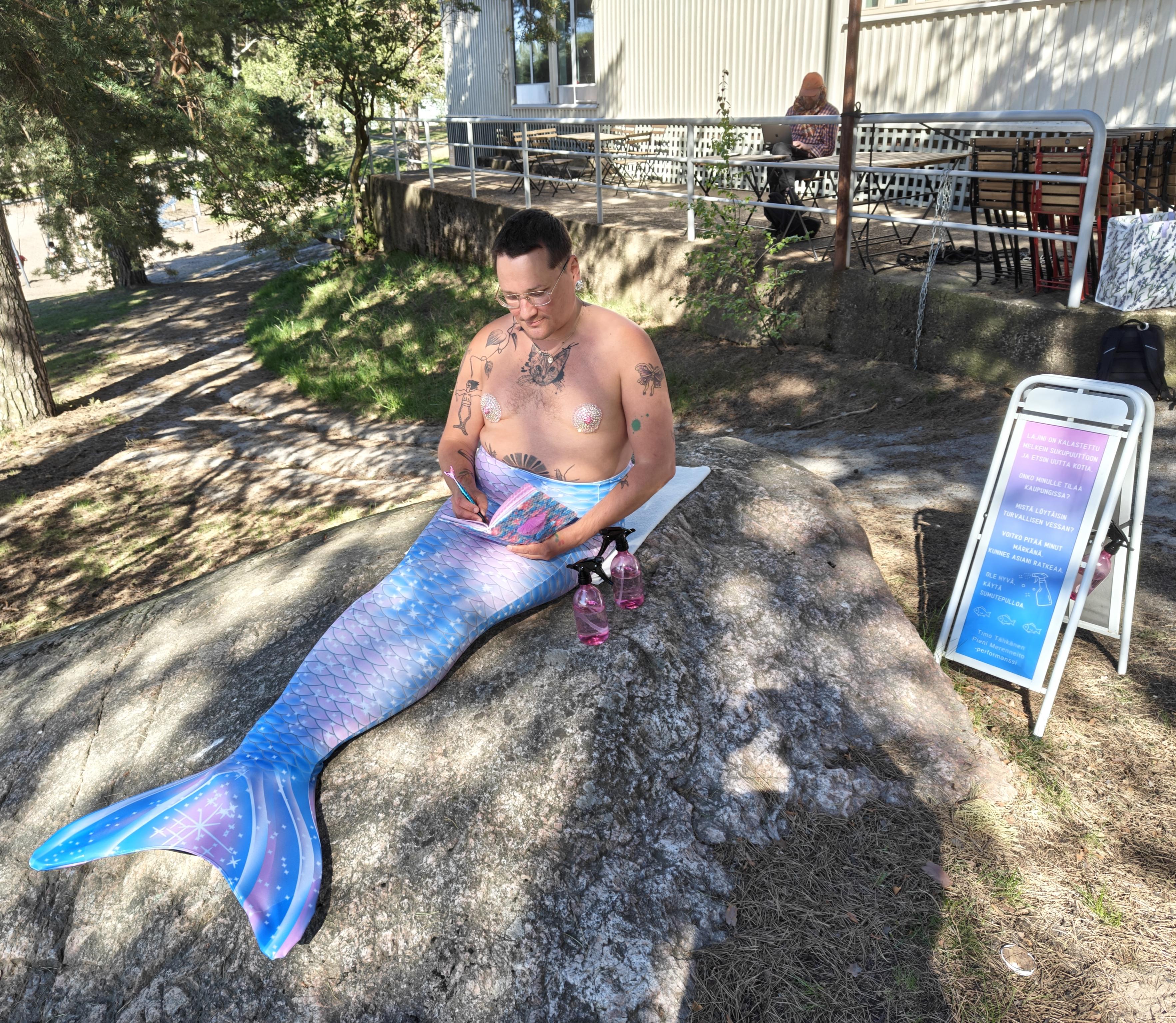 Beside the mermaid, there was a sign explaining the purpose of the performance. Additionally, the sign urges to keep the mermaid wet until their matters are resolved. The audience can spray water on the mermaid using spray bottles. During the performance, the mermaid takes notes in their diary.